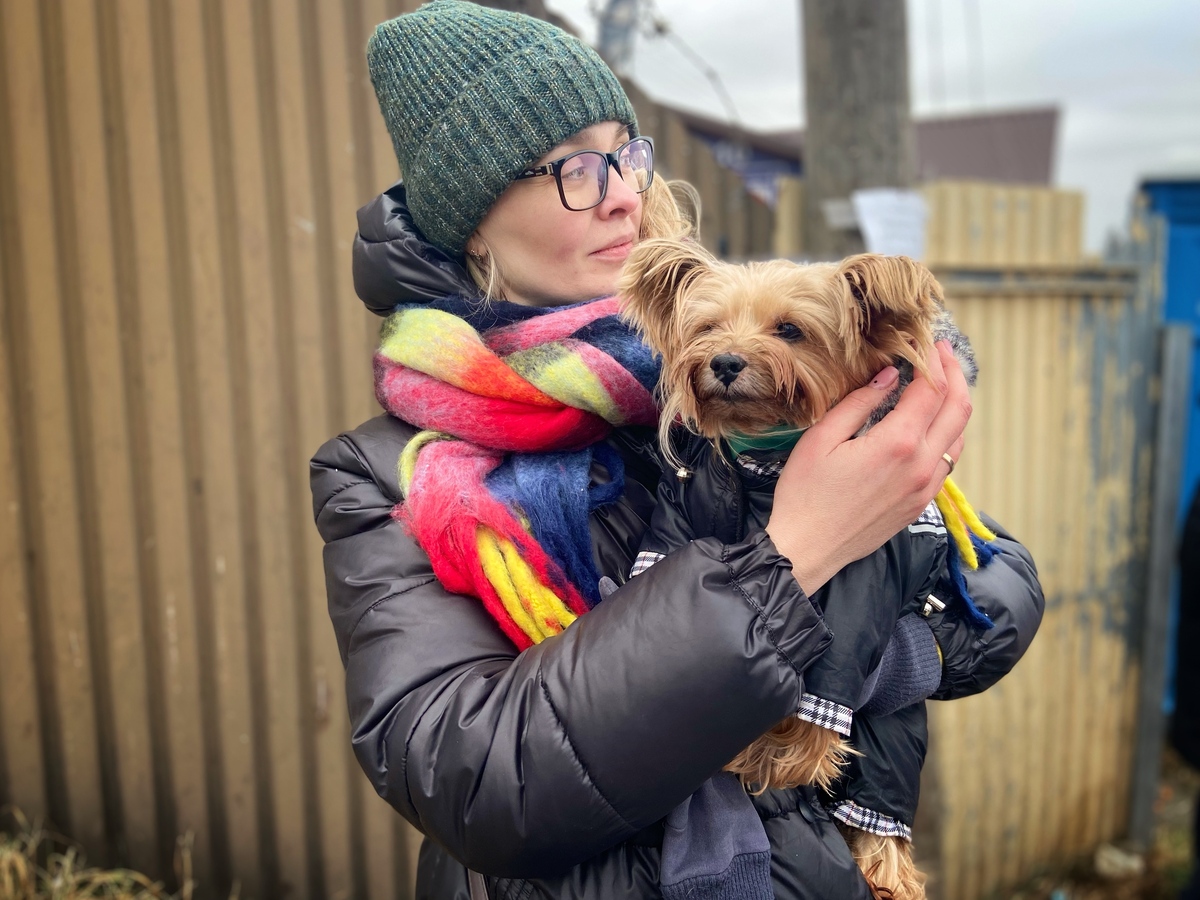 Evgenia holding her dog Kienia at Medyk border crossing in southeast Poland.