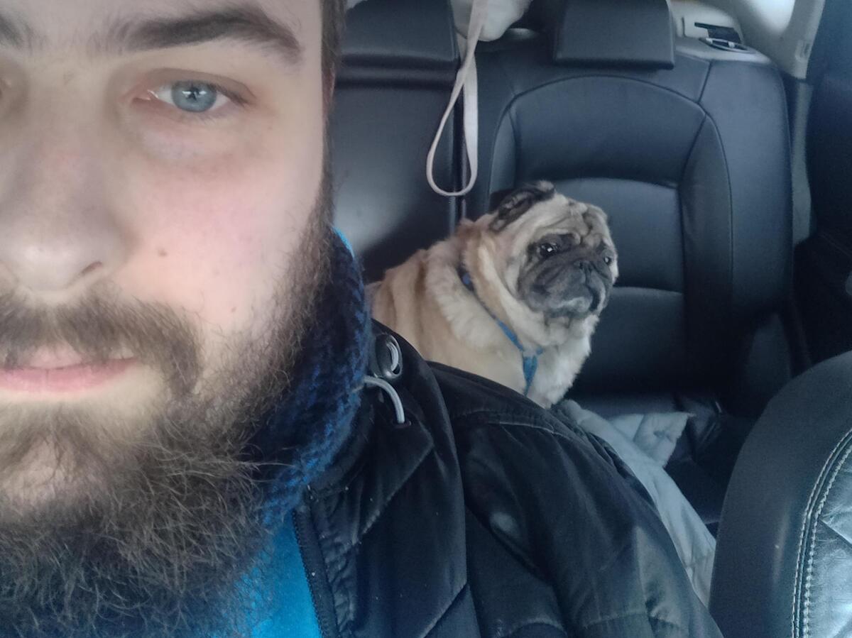 Exhausted and eager for relief, he hopped on Reddit’s r/pugs community to share a selfie of him and Puzo in the Nissan on March 6. The photo rocketed to the top of Reddit thanks to hundreds of people sharing words of encouragement and support.