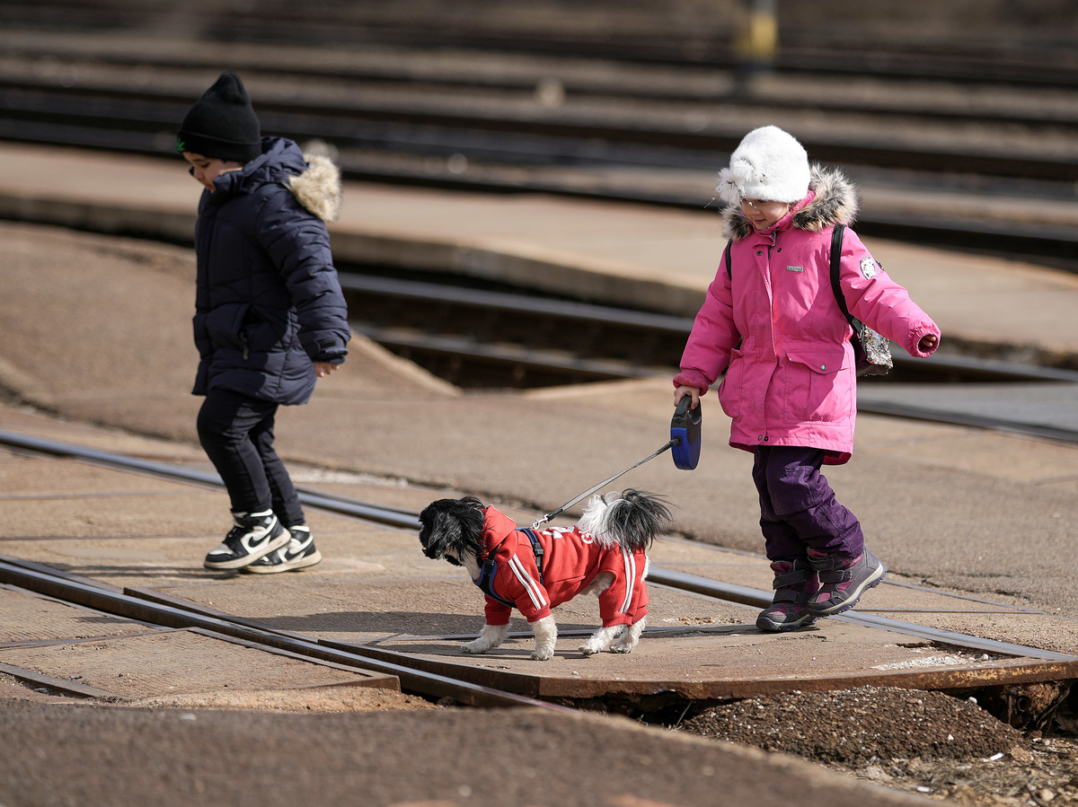Two young refugees fleeing Ukraine arrive at the border train station of Zahony with a dog on March 10 in Zahony, Hungary. Hungary, one of Ukraine’s neighboring countries, has welcomed more than 144,000 refugees fleeing Ukraine after Russia began a large-scale attack on Ukraine on Feb. 24.